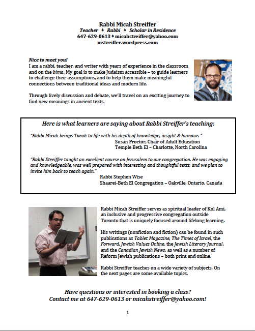 For more information or additional session topics please check out Rabbi Streiffer’s teaching brochure.